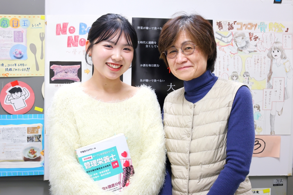 A.国試対策が充実しており、安心して勉強できる環境や仲間と切磋琢磨できる環境があります。また、調理実習や大量調理の設備が整っていて、実際の現場に近い環境で学べることや栄養教諭を目指すためのカリキュラムも充実しています。そして、先生たちが優しい・親身になってくれる・質問がしやすいという点も魅力です。教員採用試験前に、授業後も残って演習室で勉強していた時に、猿渡先生や林先生がお菓子をくれたり、「がんばれ~!いけるよ~!」と声をかけたりしてくれました。当日も試験前にメールをくれたり、本当のお母さんのように接してくれたことがとても温かく、落ち着いて試験に臨むことができました。