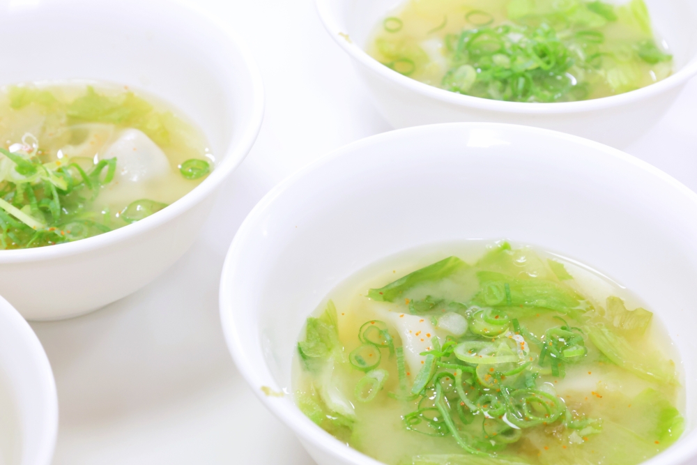 白だしのきいた白みそスープに水餃子とたっぷりの野菜が入っています。