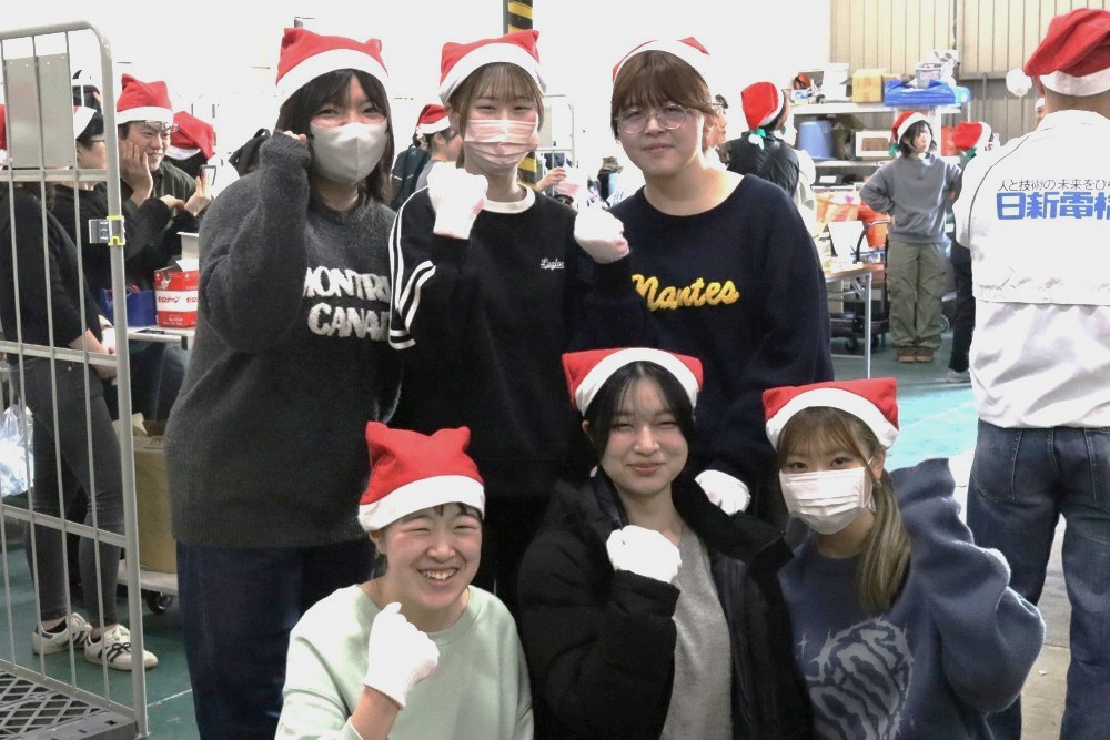 こども支援プロジェクトは、学校給食のない長期休暇中に就学援助受給世帯などに食品を直接送付する活動です。 学生たちは、スタッフの方々やボランティアのみなさんとともに、こどもたちへの一斉出荷作業を経験しました。 サンタ帽を身につけ、みんなで力を合わせて作業していきます。